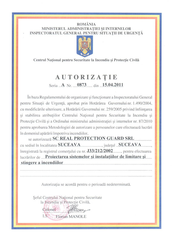 – autorizată de MAI prin IGSU pentru “Proiectarea sistemelor si instalaţiilor de limitare şi stingere a incendiilor” cu autorizaţia nr. 0873 din 15.04.2011