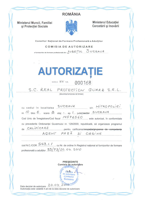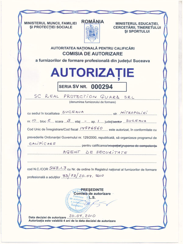 – autorizată în 2010 de Ministerul Muncii şi Educaţiei pentru organizarea programului de calificare pentru ocupaţia „agent pază şi ordine” – autorizaţia nr. SV 000168 din 20.04.2010