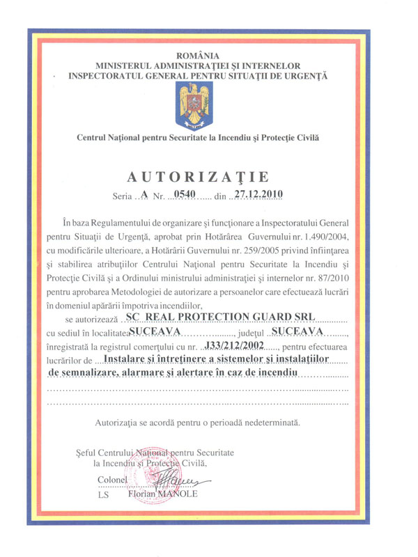 – autorizată de MAI prin IGSU pentru “Instalare şi întreţinere a sistemelor şi instalaţiilor de semnalizare, alarmare şi alertare în caz de incendiu” cu autorizaţia nr. 0540 din 27.12.2010