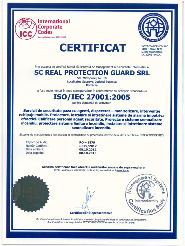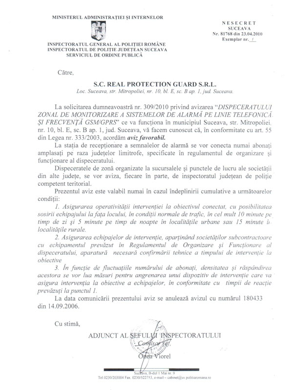 – licenţiată în 21.02.2005 pentru servicii de proiectare, instalare şi întreţinere sisteme de alarmare împotriva efracţiei conform legii 333/2003 cu licenţa nr. 0117 / T ( licenţa a fost reavizată din trei în trei ani de IGPR )