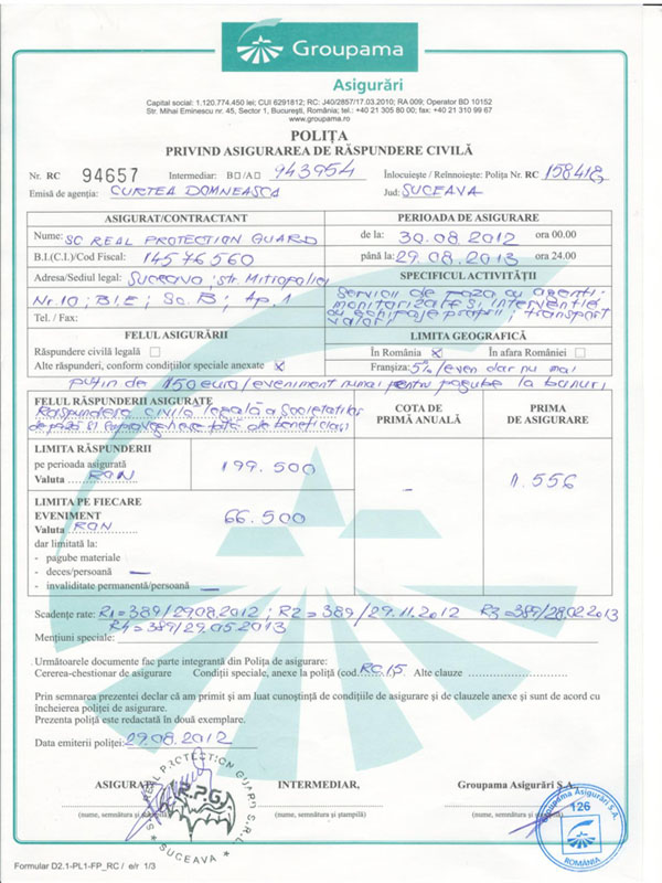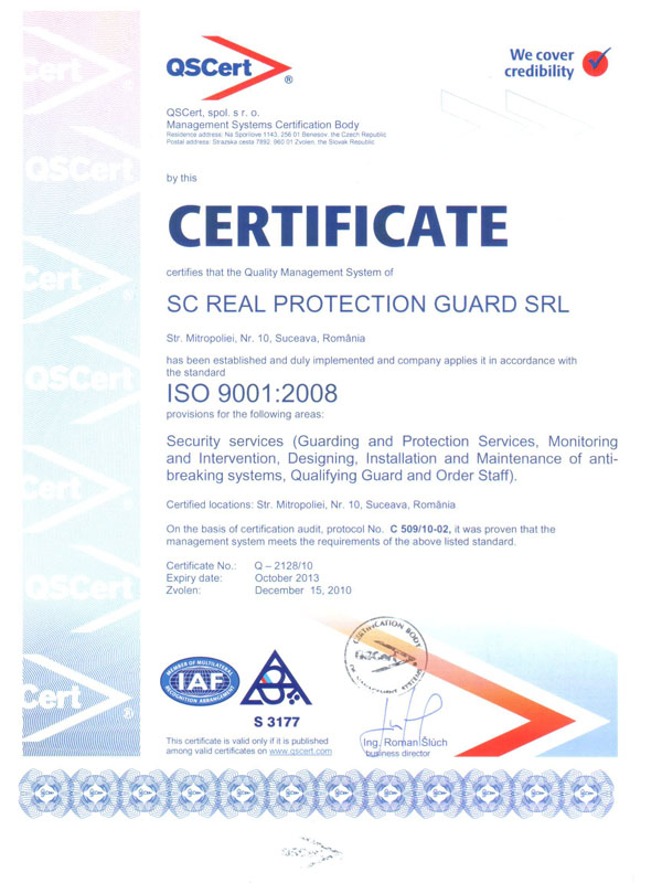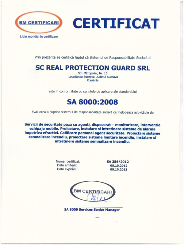 Societatea Real Protection Guard SRL a reuşit ca într-o scurtă perioadă să obţină toate autorizaţiile necesare pentru o paletă completă de servicii de securitate. Calitatea serviciilor şi permanenta grijă de îmbunătăţire a acestora a făcut ca societatea să fie un etalon în rândul firmelor care asigură servicii de securitate, mai ales în jud. Suceava.
