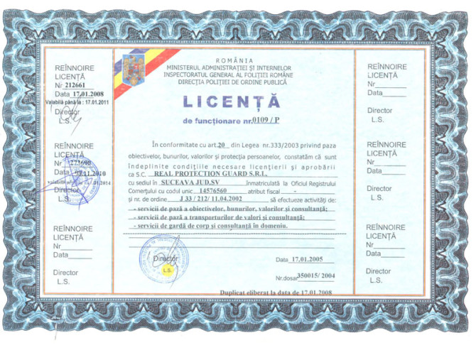 – licenţiată în 17.01.2005 pentru servicii de pază conform legii 333/2003 cu licenţa nr. 0109 / P ( licenţa a fost reavizată din trei în trei ani de IGPR )